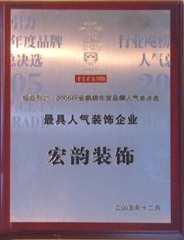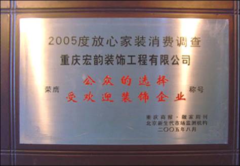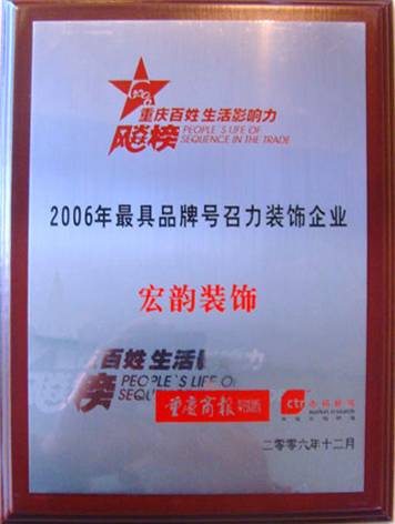 公司自成立以來,不斷銳意進取、開拓創新,以其深厚的文化底蘊和“誠信為本、誠信興業”的管理理念,創造了許多精品工程。先后榮獲重慶市2005年行業飆榜年度總決選“最具人氣裝飾企業”、2005年放心家裝消費“公眾的選擇最受歡迎裝飾企業”、“環保節約型家裝示范企業”、“連續6年零投訴企業”、“重慶市2008年消費者最喜愛裝飾企業”、“重慶市2008年最具號召力裝飾企業”等榮譽稱號。 一個優秀的企業,總是不斷改革,不斷的創新,始終走在行業的前沿。宏韻裝飾一貫堅持“深化改革求發展”的經營思路,敏銳捕捉市場最新信息,把握細節,勇于創新,提出許多新的經營模式,贏得了業界及廣大消費者的高度認可。