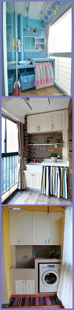 【實用洗衣臺】實用主義的你一定最愛這種設計。通常陽臺的功能就是晾衣服,不如就把整個洗衣間放在這里,但是不要隨隨便便的就把洗衣機放在那里喲,像這三個案例一樣去設計吧!美得讓你愛上洗衣服。