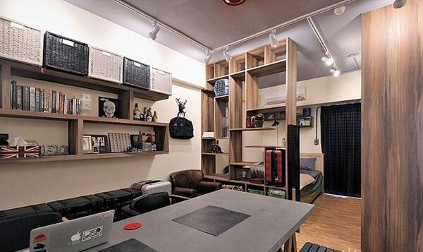 在這個一室三用的空間里,房主以最為簡單直接的裝修設計方式來使用這一空間,既做到了強收納,也不影響整體使用的便利性。比如墻面上的書架,在可以收納的同時也裝飾了空白的墻面。