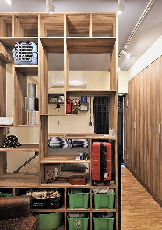 客廳與臥室之間用了一個木質隔斷儲物架來進行空間劃分,平日里,這一隔斷可以用來作收納,通過空隙處也能夠使整個空間都透出一份通透的感覺,不會使空間因為這一隔斷的因素顯得狹小。