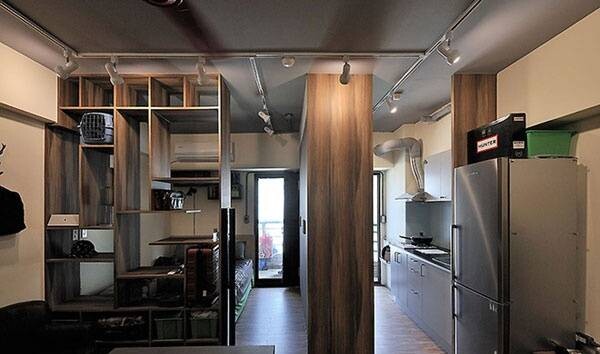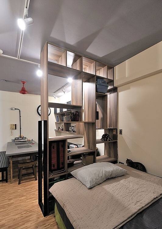 整個室內都以木質元素為主,無論是墻面上的木質隔板書架,還是用來分隔空間的木質隔斷儲物架,都讓這間屋子充滿了自然氣息。