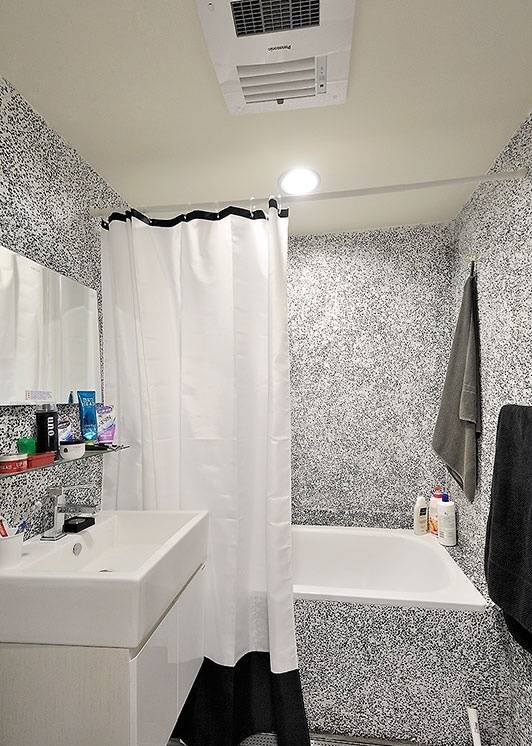 衛生間內以黑白相間的墻面呈現,白色的浴缸與衛浴柜在這一空間中都顯得尤為整潔,臺盆上方的鏡子也讓這間衛生間在視覺上有擴大的效果。