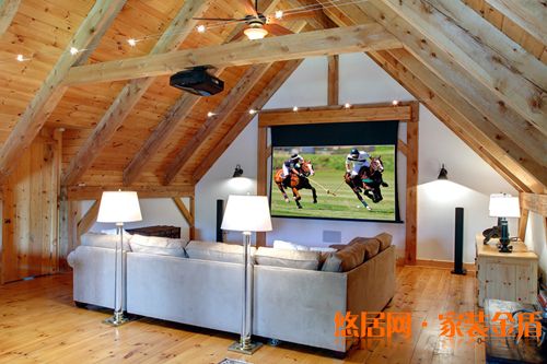 木質吊頂也是閣樓裝修設計搭配的一個亮點。顯得清新自然,低矮的空間,作為音影區(qū),讓人放松,也很有安全感。