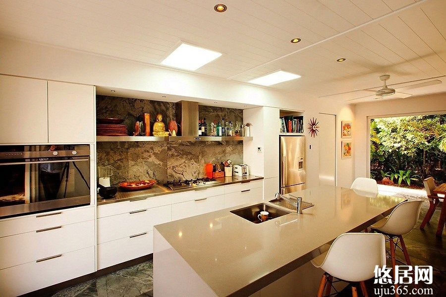 如果說你家的廚房只有一個(gè)光源,那么重慶房屋裝修小編相信你肯定曾有過這種類似的尷尬:在一個(gè)吸頂燈下淘米,但是即使眼睛是瞪得大大的,也總是會(huì)遺漏掉一些壞米沒有被清理出來。所以現(xiàn)代廚房中的燈光設(shè)計(jì)通常都是分為兩個(gè)層面,除了對(duì)整個(gè)廚房有個(gè)全局的照明之外,還會(huì)在洗滌區(qū)和操作臺(tái)的區(qū)域設(shè)置櫥柜專用射燈,這類射燈的光線適度,開關(guān)也方便,對(duì)在廚房做事提供了很大的便利。