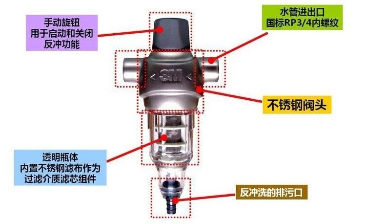 前置過濾器通常為“T”型結構,上面的“一橫”的位置左右兩端分別為進出水口。下面的“一豎”位置為機身和內部的筒形過濾網,最下端則為排污口,靠一個閥門來控制開啟和關閉.前置過濾器的濾網精度范圍一般為5-300μm,對原水只能起到預處理的作用,千萬不能直飲。