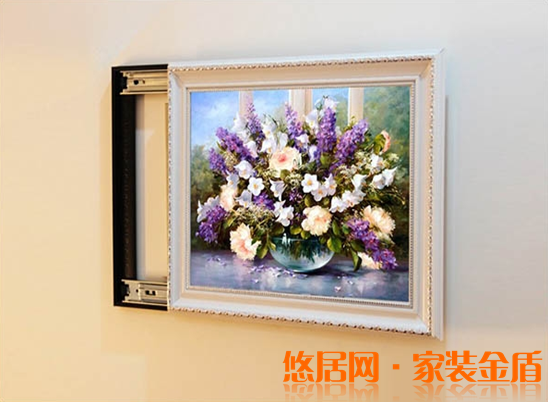 (4)如果配電箱正好在墻面中間,不妨選擇一幅合適的掛畫,把配電箱遮擋起來;若配電箱在墻面上的位置比較偏,又過于明顯,掛畫反而會顯得別扭,不如考慮造型隱藏。
