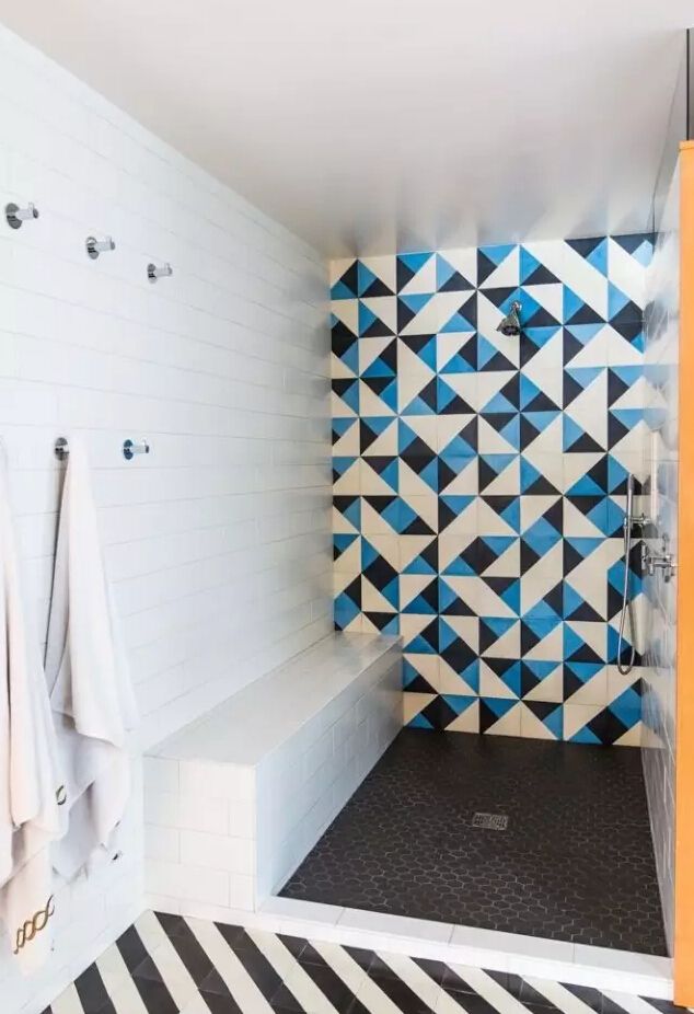 幾何紋瓷磚簡潔明快而富于設計感,也是衛浴瓷磚常用的選項。