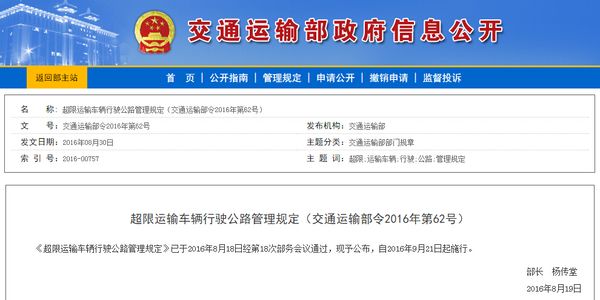 2016年9月21日,《超限運(yùn)輸車輛行駛公路管理規(guī)定》正式實(shí)行,并規(guī)定有以下情形之一的貨運(yùn)車輛即為超限運(yùn)輸車輛。