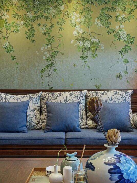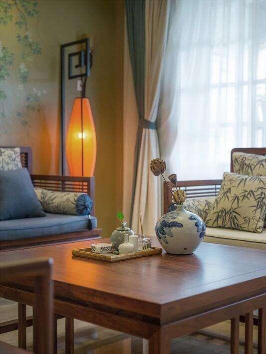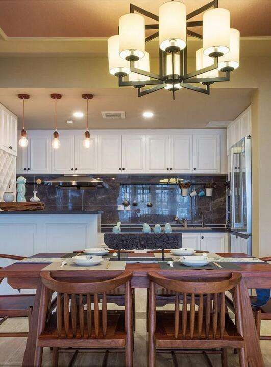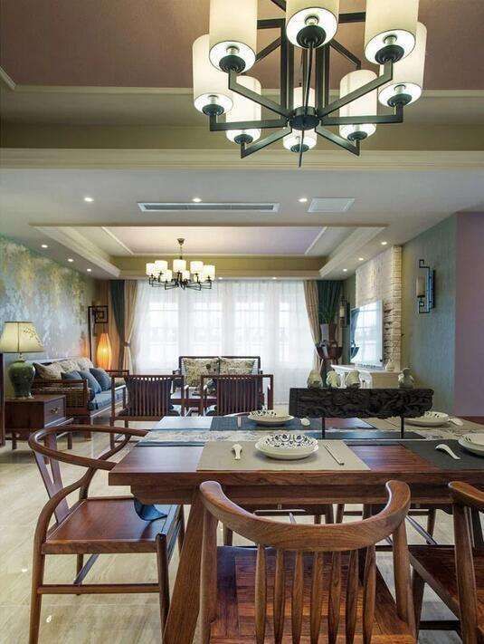 開放式格局下,木質家具環繞式的擺放抱枕上青花勾勒的竹子與桌上一色瓷器交相輝映。背景墻上的葡萄藤凌亂交錯著兩個時代。規劃出客廳的空間,依稀看見坐在主位的長輩和膝下活潑的幼兒們的天倫。餐廳和客廳像兩個時代一樣被打通,頂上八角燈金屬和玻璃的融合,總算是找到了些今昔的滋味。