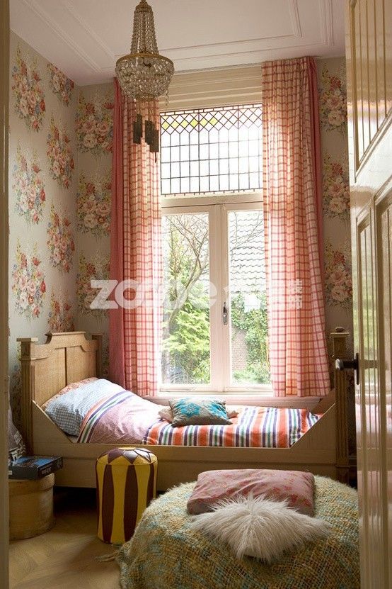粉紅格紋窗簾、泛舊精致的壁紙,這樣帶有復古格調的窗邊,誰都會忍不住駐足,小小的窗臺,簡簡單單得用幾只抱枕輕輕堆放,滿足了角落的舒適。一旁放上幾本好書,添置一盆最愛的花,窗邊角落即刻變身為閱讀角,而最有韻味的無疑是開到一半的窗簾了,半遮半掩間,散發出淡淡的浪漫氣息。
