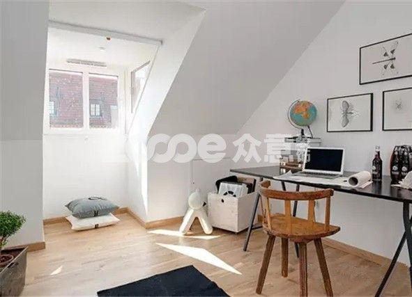 設計師充分利用了空間的優勢,窗戶兩側的傾斜墻體讓小小的窗口空間顯得十分立體,同時因墻體的遮擋,采光相對變得更加集中,書房的亮度得以提升。