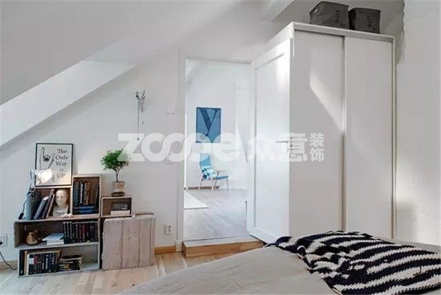 白色的衣櫥放在臥室門后的角落位置,充分利用了空間也很自然,讓臥室整體在視覺上顯得更加寬敞。