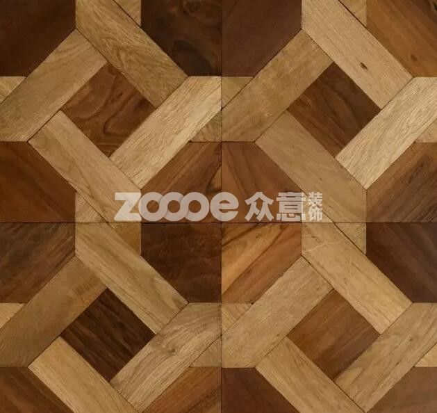 以六角形地板為中心想周圍擴散,六角形地板的六個邊利用地板來契合,這樣的地板鋪設方法更加考驗施工工藝。