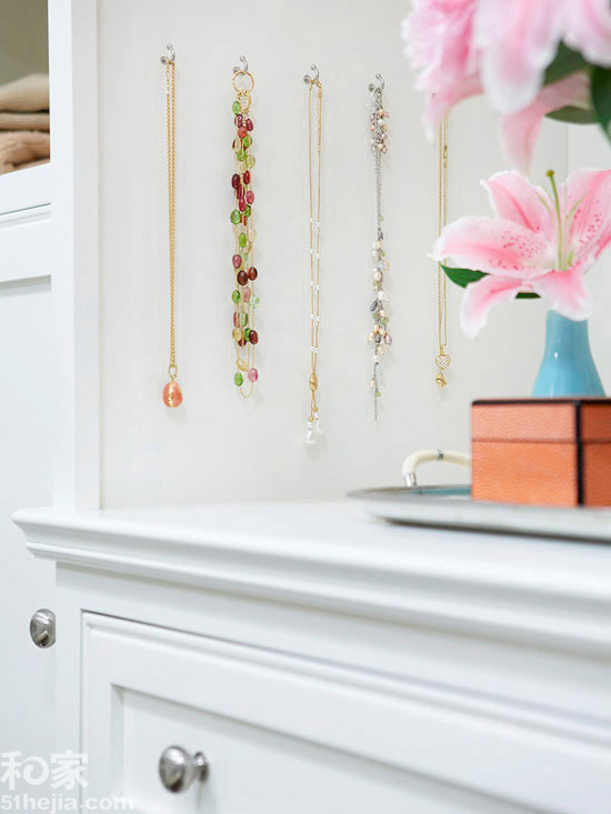 一般家庭的女主人都有很多閑置的小玩意,不妨把這些小玩意兒用簡(jiǎn)單的掛鉤,安置在墻壁上。絢麗的珠寶會(huì)讓墻邊變得精巧耐看。
