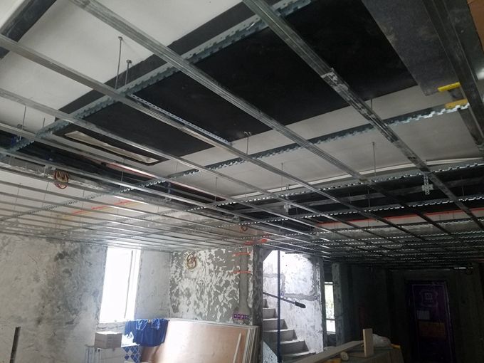 天古渝派精工·輕鋼龍骨吊頂工藝:平頂及直線造型頂。主龍骨、副龍骨、邊龍骨全部采用鍍鋅輕鋼材質(zhì),使用沉頭螺絲錨固。主龍骨要求間距900㎜,次龍骨要求間距400㎜ 。