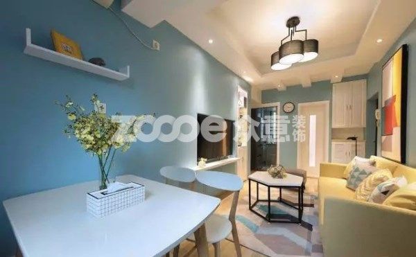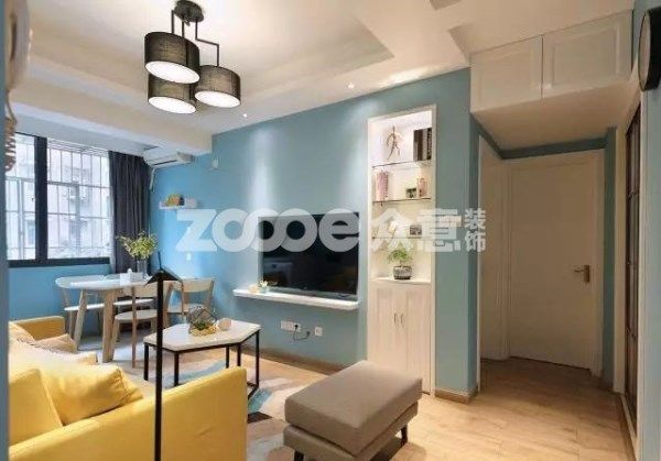 改造后,由于受到業主的制約,不能改動門的高度和尺寸,設計師選擇用白色的基色來弱化這種效果,讓空間的豐富色彩來平衡硬件的不足。完全內嵌電視的保留,在原本不寬裕的客廳空間上,很好的得以最大化利用。
