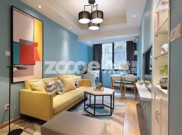 利用電箱位子的偏移,我們搭配了長方形的裝飾畫,無規則豎置,很好的隱藏了電箱,讓空間美而有趣。明黃色布藝沙發,搭配淺藍色墻面,互補色的視覺沖擊,讓整個起居室充滿陽光感。