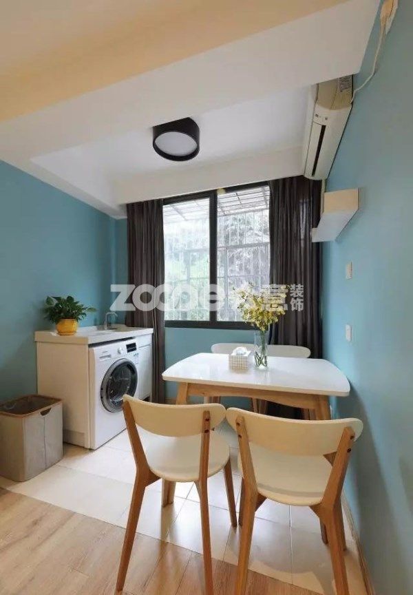 改造后,設計師并沒有完全取消洗衣的功能,在滿足就餐的功能下,保留并從新設計了洗衣區。滾筒式內嵌洗衣機搭配一體式水槽,并把晾衣區設計在戶外,制作了雨棚和升降衣架功能。
