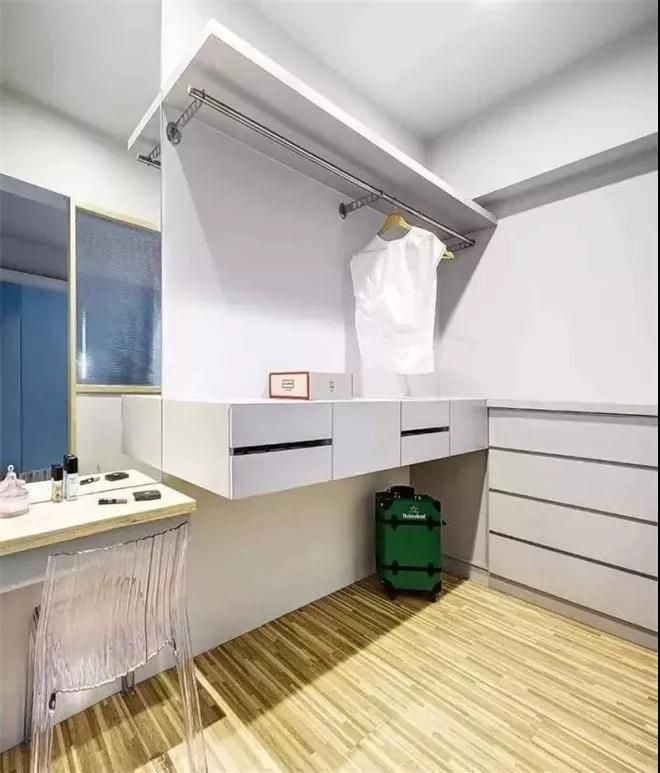 這是臥室的另一個房間,說是臥室,其實更應該稱這里為休閑區,主要突出功能性和舒適性,左面全為柜體式墻面,打開里面空間容量大,輕松解決空間收納問題。