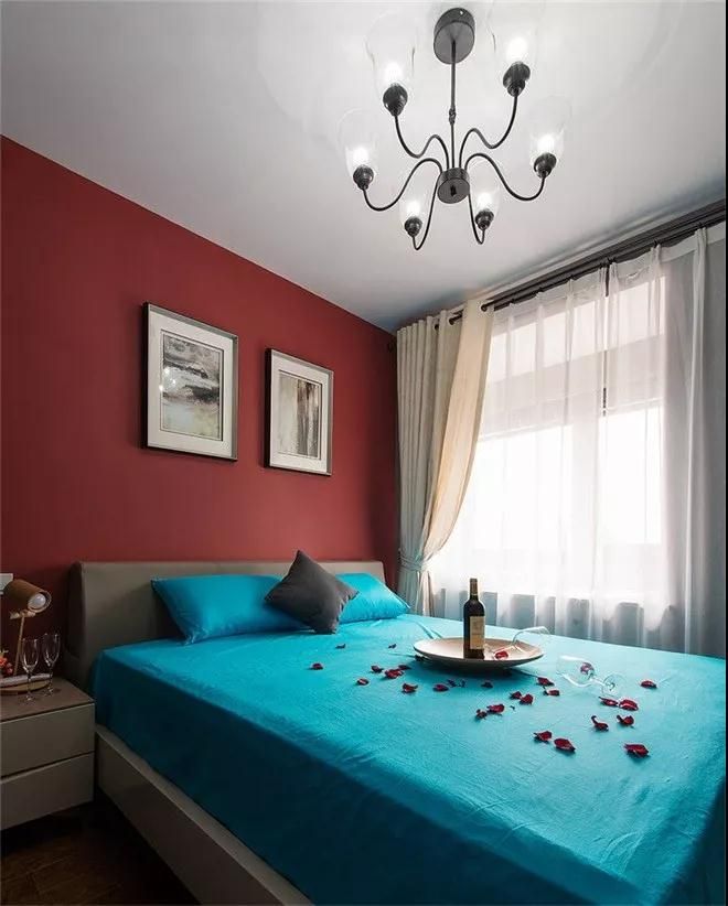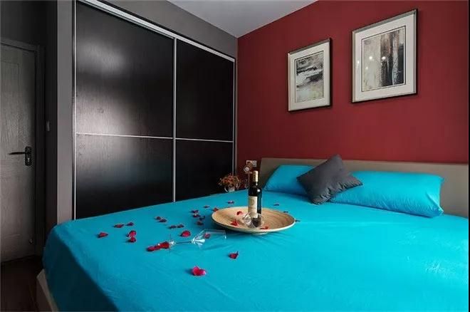 自古紅藍出CP,紅與藍色撞色就非常值得期待了,主臥墻面以大紅色為主,配以藝術裝飾畫,床主色湖藍,以灰色抱枕搭配,非常搶眼。