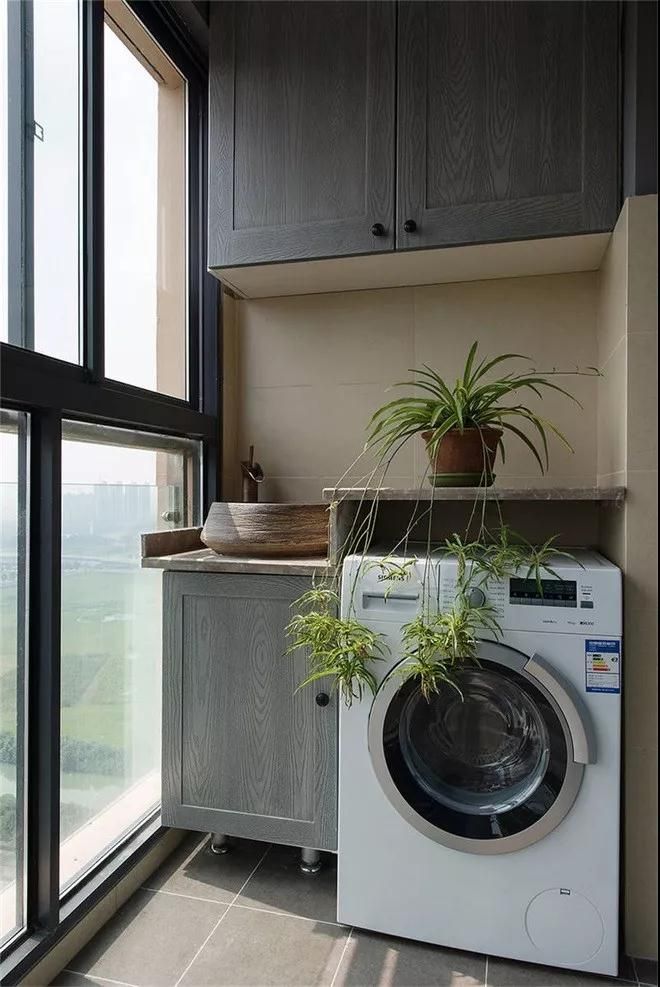 陽臺以實用性為主,半封閉式設計,沒有花哨的裝飾,配備洗衣機,方便日常使用。