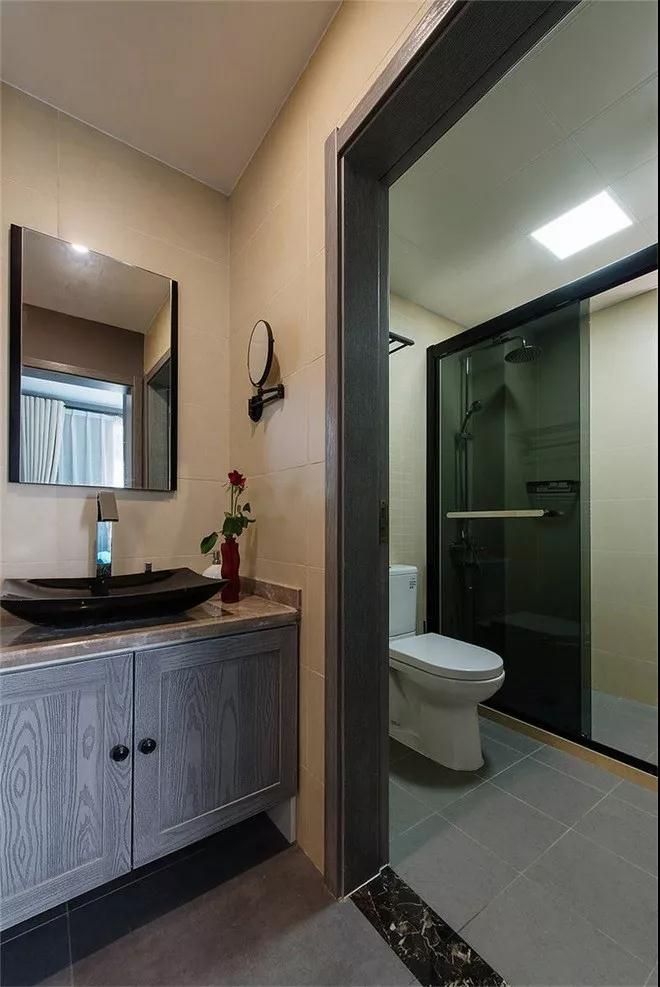 衛生間做了明顯的功能分區,將干濕分開,淋浴以玻璃門做格擋,增加門沿,避免水濺入。