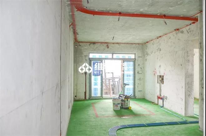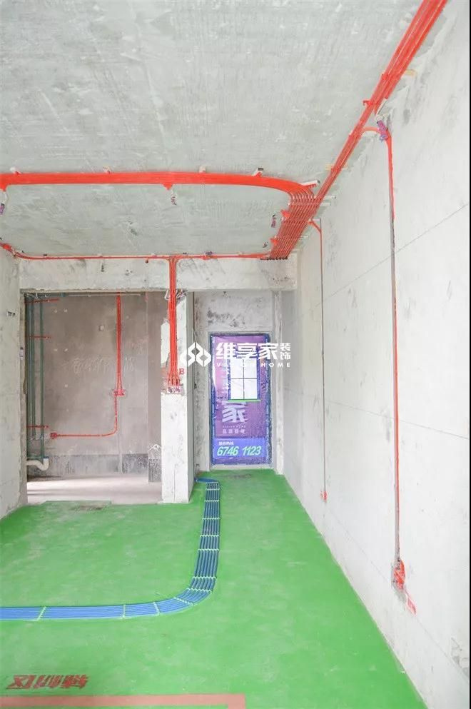 開門往里走,進入客廳區域,整個房間用綠地固鋪滿,其上線管整齊排列,規范整潔。