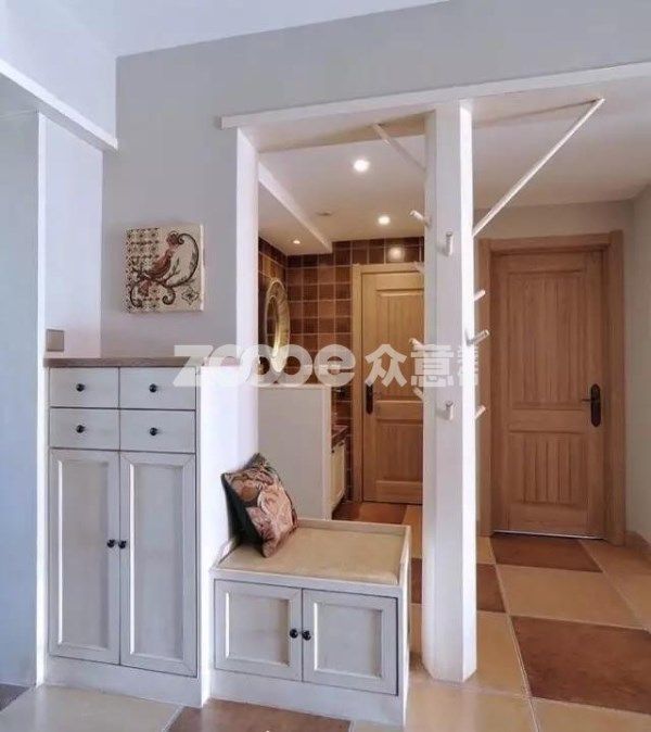 隔斷墻材質可以多樣性,如果喜歡通透性的可以用鏤空的木架玄關;如果喜歡遮擋強的,可以直接定制玄關柜或者砌隔斷墻。