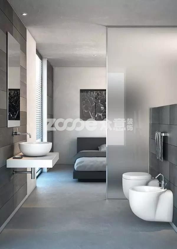 有些業主不喜歡直接將主臥設計成單獨的小房間,就會用隔斷墻的形式來隔開床和衛生間。玻璃隔斷是最常用的主衛隔斷。
