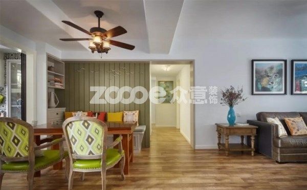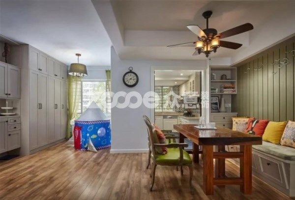 餐廳與廚房相鄰,借光穿透,解決就餐區采光問題,吊扇燈與卡座實用。