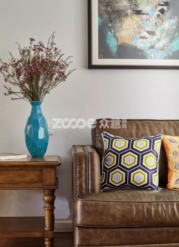 客廳咖色皮沙發搭配實木邊幾,點綴裝飾畫,復古沉穩又不失格調。