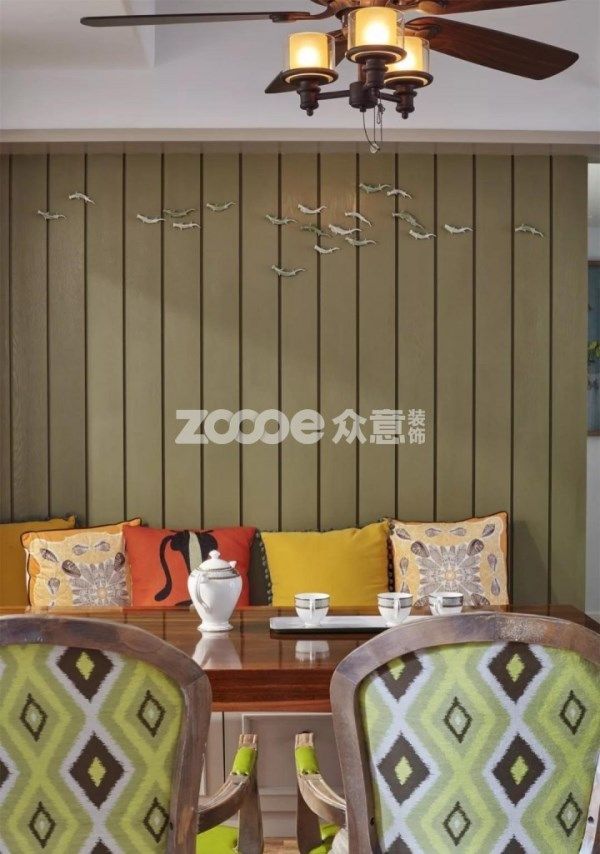 芥末綠拉槽背景墻,點綴小魚裝飾,生動賦有靈性,撞色靠背提亮空間。
