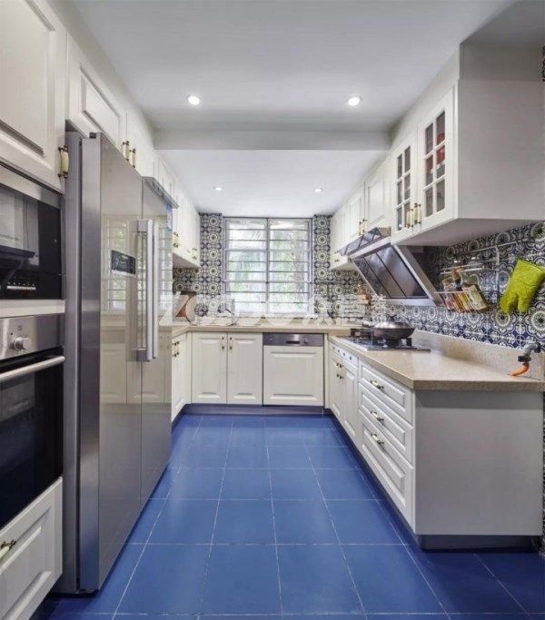 廚房藍色地磚搭配藍調花磚,定制櫥柜收納大型廚電,U型廚房,合理打造料理空間。