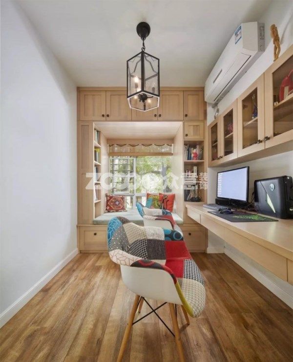 書房通過白色與木色搭配,呈現輕松色調,木作雙人寫字臺,長條吊柜與飄窗的“回”形柜體,充分利用空間。