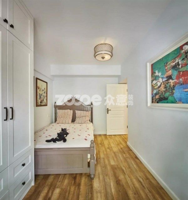 次臥留白墻面點綴幾幅色彩裝飾畫,結合一組白色衣柜,簡約實用。