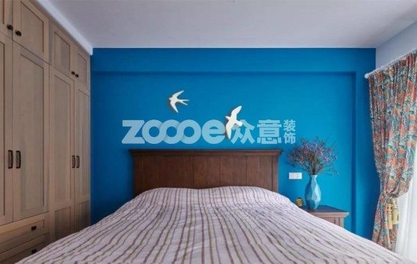 主臥白色乳膠漆墻面搭配藍色床背景,飛鳥墻飾寓意浪漫。