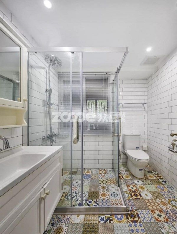 主衛地面通鋪花磚,搭配豎鋪灰色墻磚,淋浴房與浴缸,功能齊全。