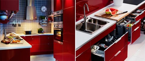 采用高亮面白色門板的櫥柜,除了讓諸多廚房用品得以有置放收納空間,大膽鮮艷的紅色系,更讓廚房躍升成為居家視覺焦點,下廚作菜也能在視覺上獲得享受。