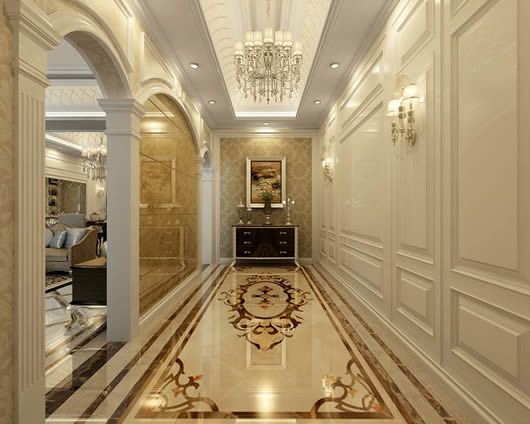 地板顏色宜較深沉:深色象征厚重,地板色深象征根基深厚,符合風水之道。如要求明亮一些,則可用深色石料四周包邊,而中間部分采用較淺色的石材。如若選擇在玄關鋪地毯,其道理亦同,宜選用四邊顏色較深而中間顏色較淺的地毯。