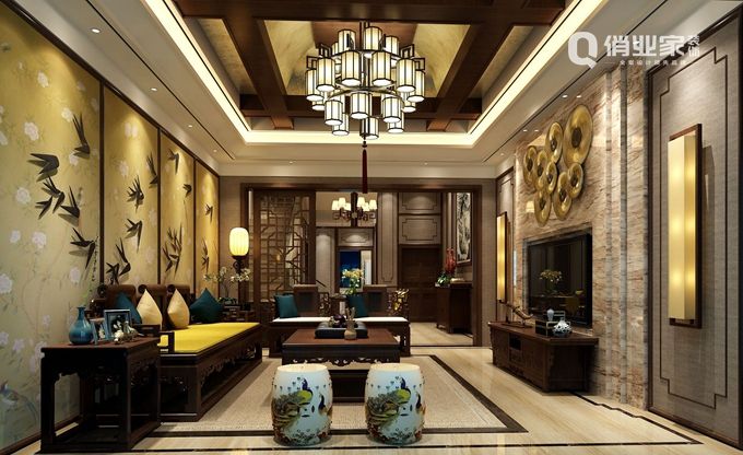 2、新中式風格:新中式風格的家裝則會運用壁紙、玻化磚等材質做墻面和地面的處理,而在裝飾方面則是搭配飽和度略高的紅、黃、藍、綠等色作為局部色彩。