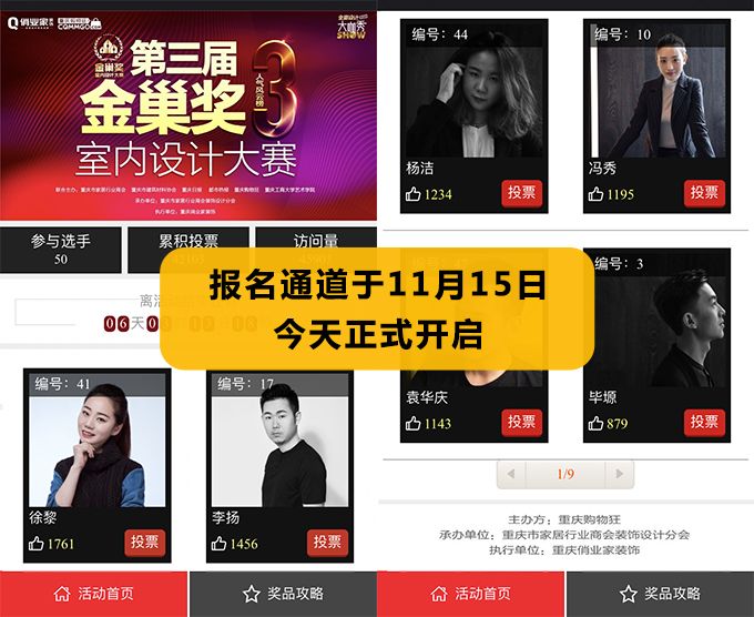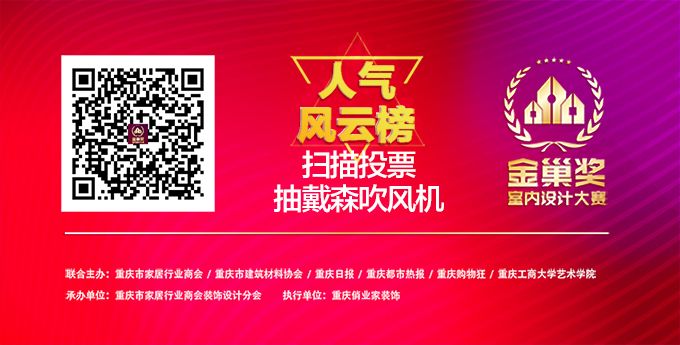 大賽投票時間為11月15日到11月21日,得票最高的第一名“網紅”設計大師將獲得第三屆“金巢獎”室內設計大賽組委會頒發的【超級人氣獎】。