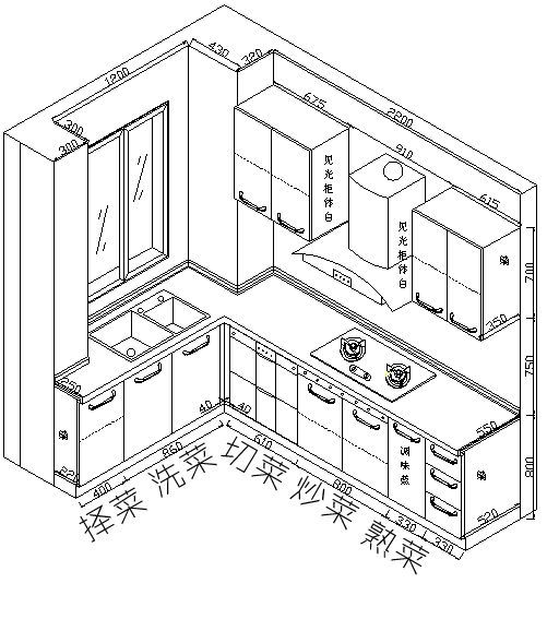 如果位置充裕,可以升級成: 擇菜(臺面)→洗菜(水槽)→切菜(臺面)→炒菜(爐灶)→熟菜(臺面) 擇菜和熟菜的臺面最好在400mm以上。