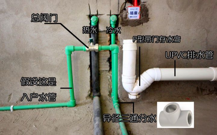 水電規劃 洗菜區水路規劃 水路規劃分為給水和排水。 給水里面走的是干凈的自來水,排水里面走的是生活污水。 給水(PPR管):一般進戶水閥開發商都會預留在廚房,用三通分出水槽和其他地方用水管道,左熱右冷間距200mm,有吊頂的話水管可以走天。 排水(UPVC管):在公共排水管道利用彎頭和水管接出到水槽下方。