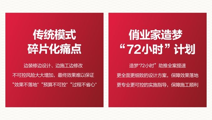 俏業家裝飾第三屆315全案家居保障月,造夢“72小時”計劃助推全案騰飛,針對過去邊裝修邊設計、邊施工邊修改的裝修痛點,從源頭規避煩惱,讓您尊享全屋全套全案圖紙方案極速定制,提前掌握全套設計方案,裝修盡在計劃之中,真正告別傳統模式碎片化方案設計。