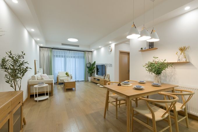 色彩基調(diào)是白色和原木色,白墻落地+木質(zhì)家具,局部用綠植添加一絲活力,這些自然素材的“和諧”讓整個(gè)大空間顯得自然且淡雅。