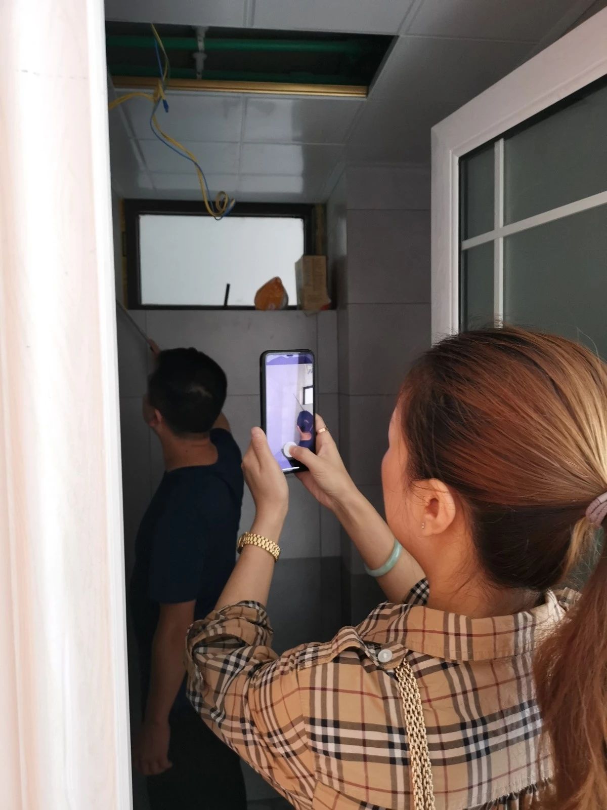 檢查衛生間瓷磚空鼓情況。現場,樂尚裝飾總裁親自錄制巡查實時視頻,將檢查情況反饋給業主。