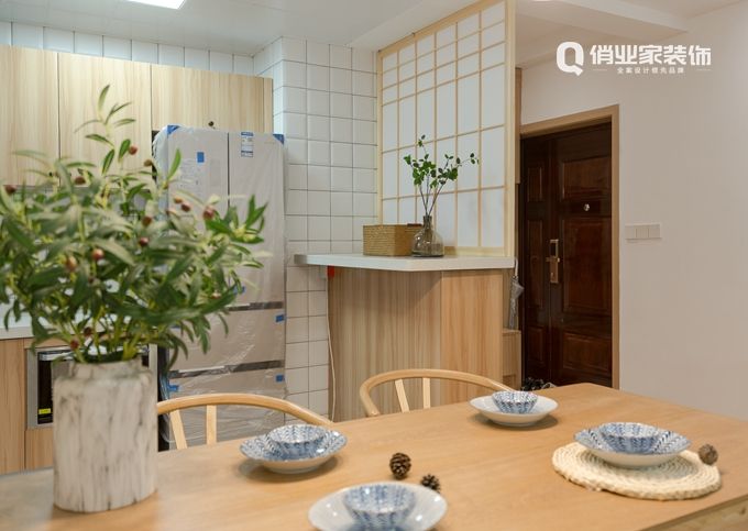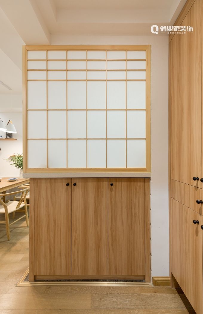 一進門,就發現玄關的設計實用而極具心思。實用性的換鞋凳、大收納功能的鞋柜。同時,木質材料搭配半透明的樟子紙,以經典的日式推拉門款式做隔斷,朦朧的通透感符合日式MUJI風,簡練之余多了些自然的韻味。
