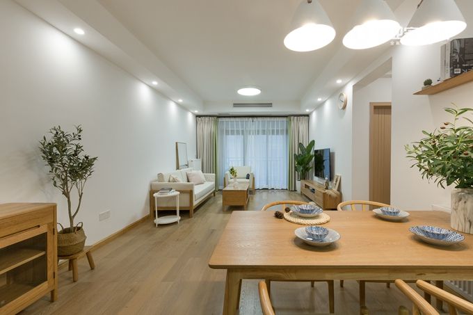 客廳的色彩基調是白色和原木色,白墻落地+木質家具,局部用綠植添加一絲活力,這些自然素材的“和諧”讓整個大空間顯得自然且淡雅,也讓戶型不大的空間看著更加通透敞亮。