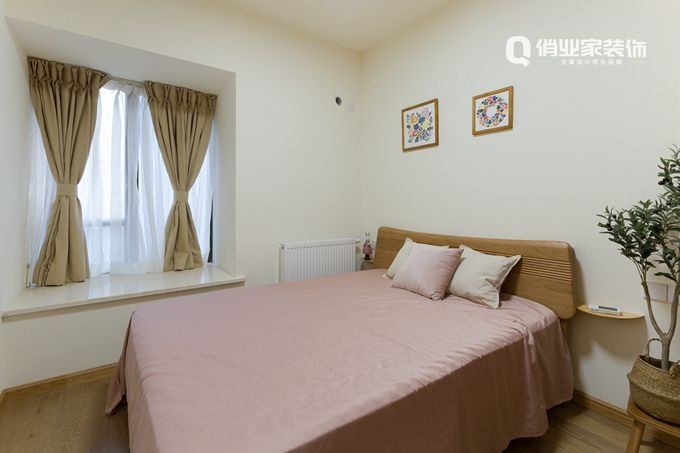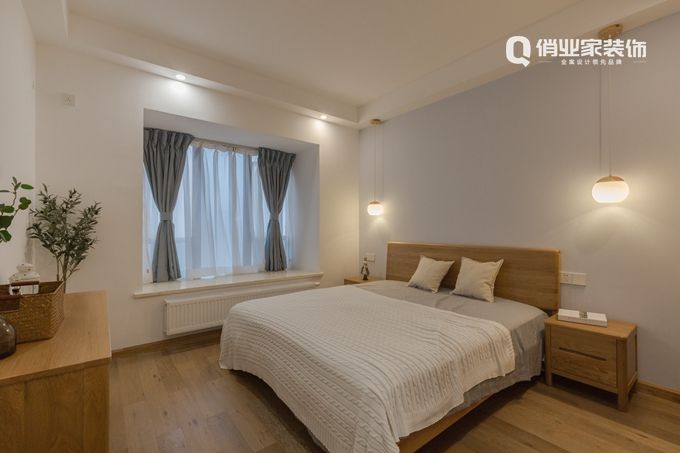主臥布置淡雅簡潔,硬裝/家具線條清晰,有較強的幾何感,角落里的綠植木枝讓臥室充滿寧靜、平和的氛圍。