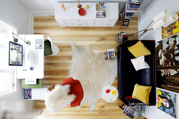 以不同的視覺俯瞰我們常年居住的空間,會獲得另外一種視覺感受。方形空間,沙發、邊柜、書桌都有序擺放,有緊有散,不會產生壓抑感。大大的玻璃窗讓陽光投射進來,白色為基礎的空間更為膨脹,清爽木色融入,點燃空間明媚氣氛。